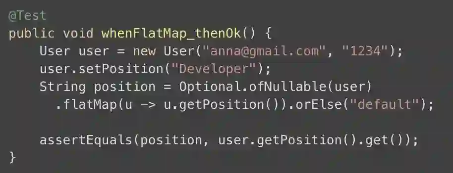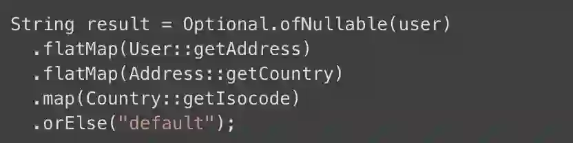 既然 getter 方法返回 String 值的 Optional,你可以在对 User 的 Optional 对象调用 flatMap() 时,用它作为参数。其返回的值是解除包装的 String 值:
