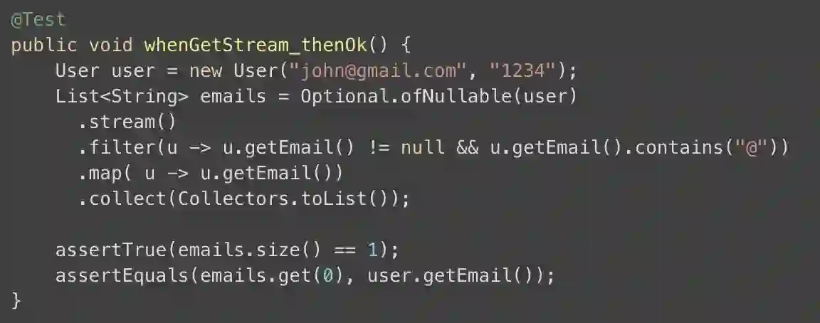 最后介绍的是新的 stream() 方法,它通过把实例转换为 Stream 对象,让你从广大的 Stream API 中受益。如果没有值,它会得到空的 Stream;有值的情况下,Stream 则会包含单一值。
