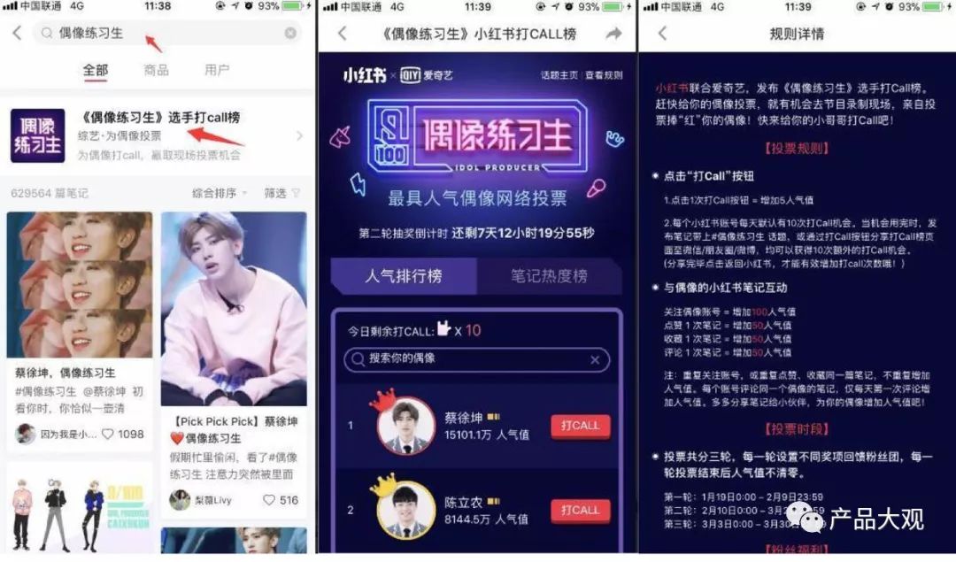 2018年1月19日,由小红书联合赞助的中国首档偶像竞演养成类真人秀《偶像练习生》全网首播,随着节目的火热开播,作为联合冠名商,小红书除了常规的在节目中的中插、logo、口播、贴片外,还邀请偶像练习生在小红书中发布动态,同时,开通官方投票通道,让粉丝为喜爱的练习生打call。