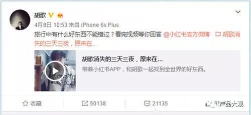 2016年4月小红书即将三周年,策划了《胡歌和小红书的三天三夜》系列活动。小红书通过将胡歌打造为一个“普通用户”,跟着小红书的笔记寻找好东西,营造了非常真实、清晰的使用场景,代入感很强。