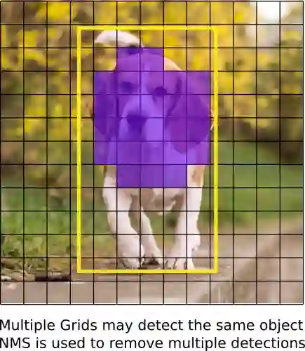 非极大值抑制:非极大值抑制(NMS)可解决对同一个图像的多次检测的问题。例如,红色网格单元的 3 个边界框可以检测一个框,或者临近网格可检测相同对象。