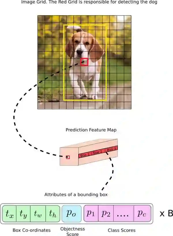 深度方面,特征图中有 (B x (5 + C))* *个条目。B 代表每个单元可以预测的边界框数量。根据 YOLO 的论文,这些 B 边界框中的每一个都可能专门用于检测某种对象。每个边界框都有 5+C 个属性,分别描述每个边界框的中心坐标、维度、objectness 分数和 C 类置信度。YOLO v3 在每个单元中预测 3 个边界框。