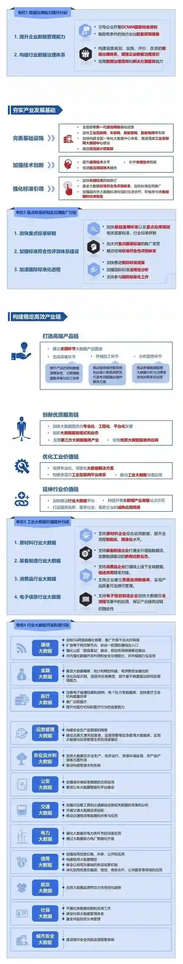 《规划》还提出要在原材料、装备制造等4个工业领域率先实施大数据价值提升行动,在通信、金融等12大行业开展大数据开发利用行动。