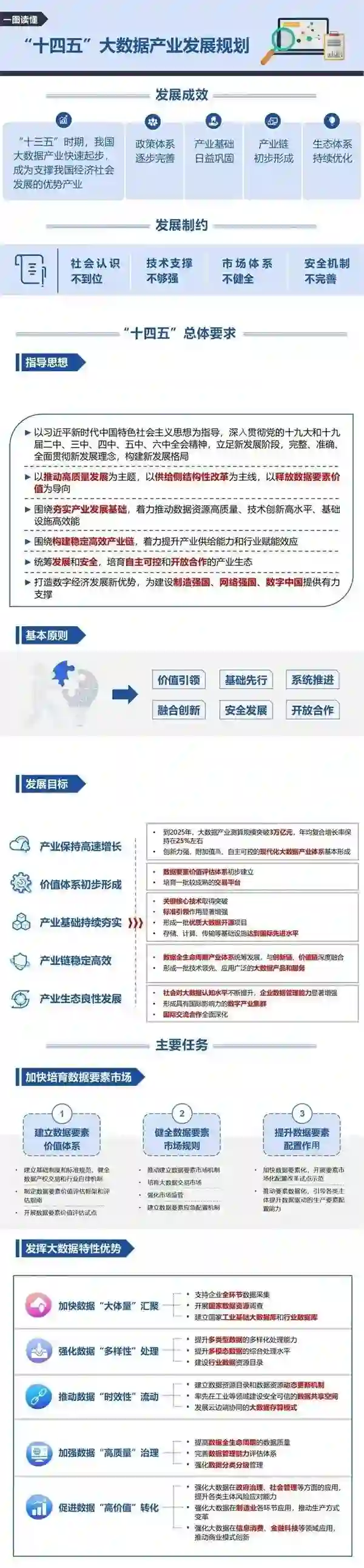 据悉,《规划》在主要任务部分,围绕加快培育数据要素市场、发挥大数据特性优势、夯实产业发展基础、构建稳定高效产业链、打造繁荣有序产业生态、筑牢数据安全保障防线六个方面提出了重点任务,设置了数据治理能力提升、重点标准研制及应用推广、工业大数据价值提升、行业大数据开发利用、企业主体发展能级跃升、数据安全铸盾六个专项行动。