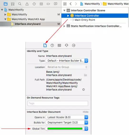 Tip2:Global Tint 设置 app 的全局主色可以选择 StoryBoard, 选中其中任意一个 Interface Controller 在 File inspector 中对 Global Tint 属性进行修改。