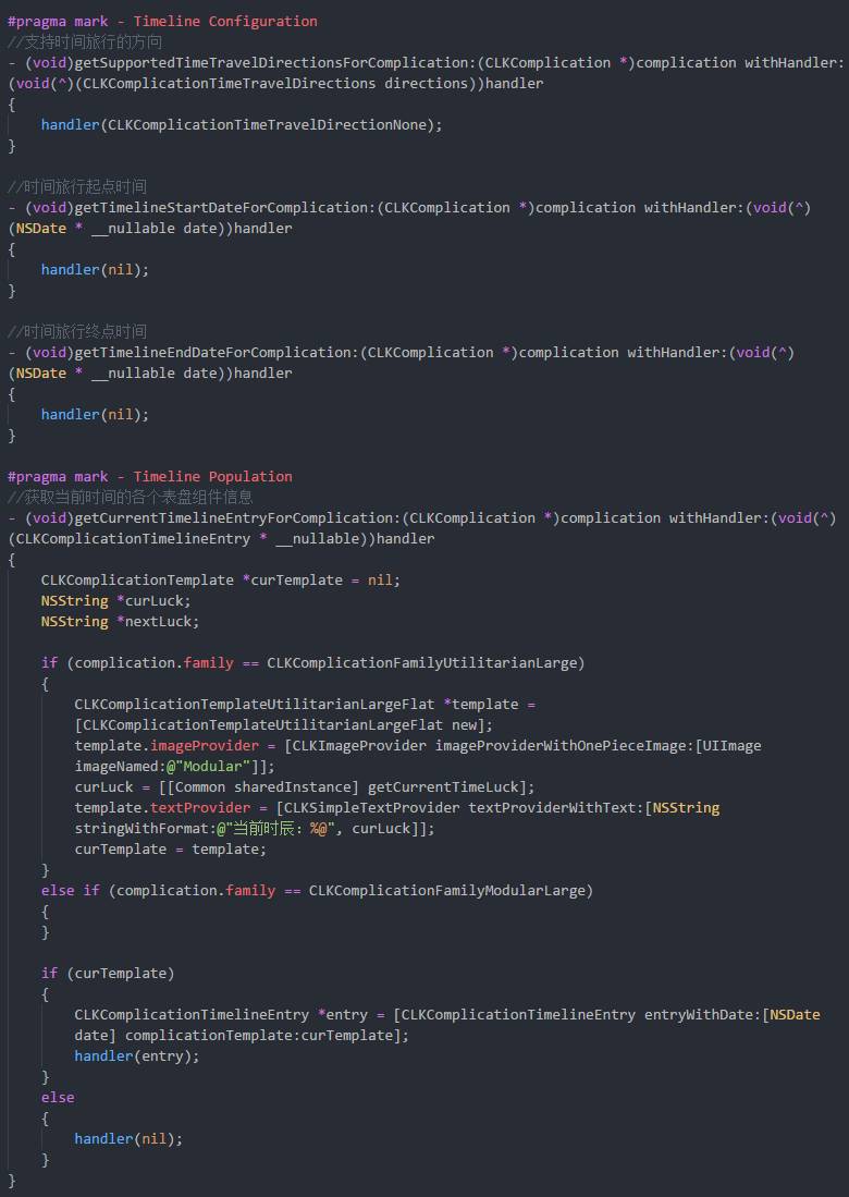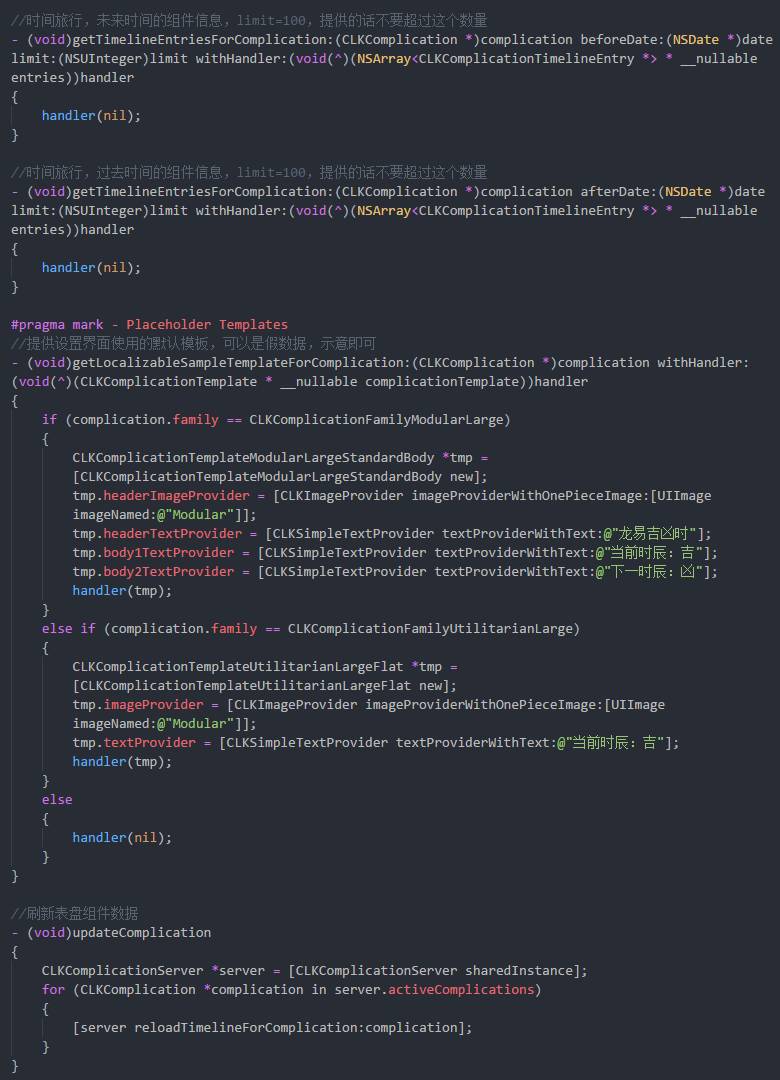 对于开发人员来说,就是实现系统提供的 ComplicationController.m 中的几个代理方法,根据不同的小组件类型,返回对应的显示模板即可。其他具体可参考这篇文章: