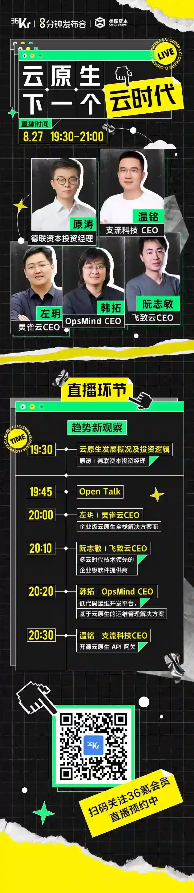 8月27日晚7点30分,德联资本投资经理原涛、企业级云原生全栈解决方案商[灵雀云] CEO 左玥、多云时代技术领先的企业级软件提供商[飞致云] CEO 阮志敏、低代码运维开发平台[OpsMind] CEO 韩拓、开源云原生API网关[支流科技] CEO 温铭,将来到36氪8分钟发布会聊一聊他们对于云原生行业发展现状和未来趋势的看法。
