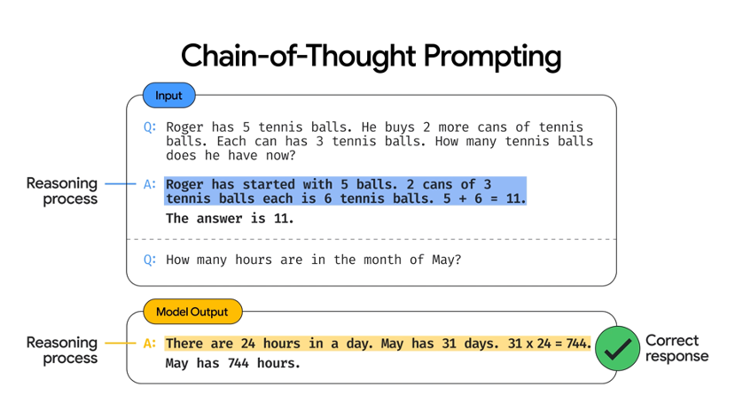在“思维提示链”中,我们给模型输入一对“问题—答案”,同时解释了答案是如何得出的。这有点像你的老师一步一步地向你讲解如何解题。现在,如果我们再问模型“五月有多少个小时”或者其它相关问题,它能给出正确答案和解答过程。