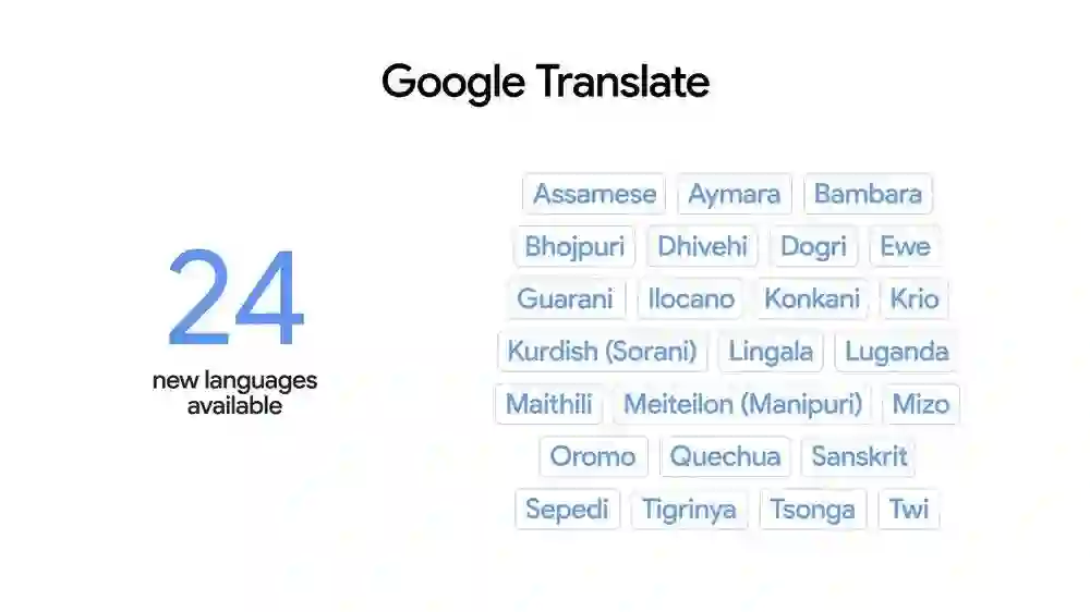 今天,我很激动地宣布,我们为 Google 翻译新增了 24 种新语言,包括首批增加的美洲原住民语言。共计有 3 亿多人在使用这 24 种语言,这样的突破正在推动我们获取知识和使用电脑的方式发生根本性转变。