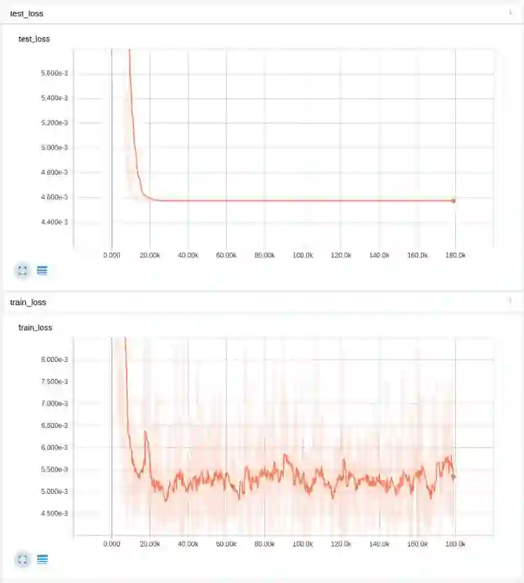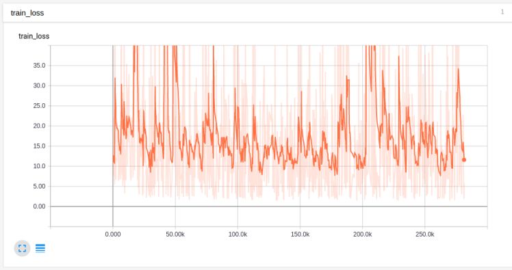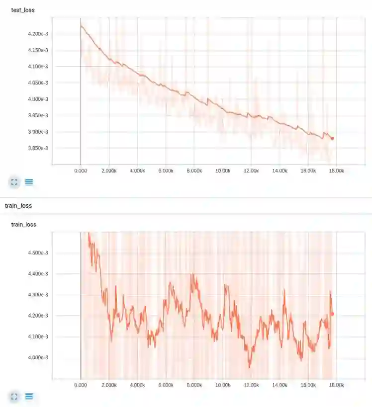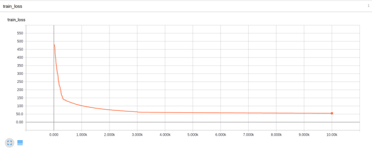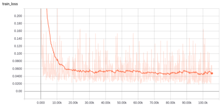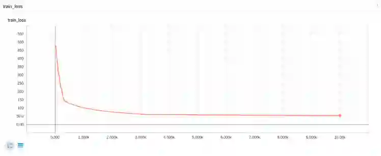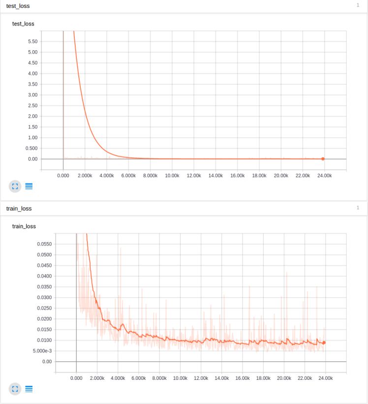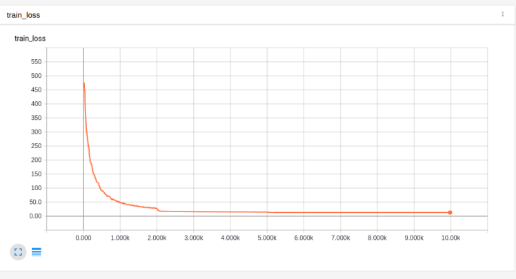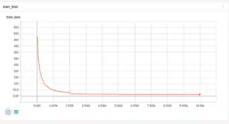 通过删除 batch normalization,我们发现,在经过一两次迭代之后,网络可以快速输出 NaN。我们禁用了 batch normalization,并将初始化更改为 variance scaling。这些改变了一切!我们能够过拟合我们的测试集,只是一个或两个输入。虽然底部的图表盖住了 Y 轴,但初始误差值远远高于 5,表明误差减少了近 4 个数量级: