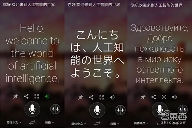 这里我们重点介绍语音机器翻译和图片识别翻译这两个功能。在语音翻译中,设置好语种的转换,比如中英翻译,当我说出“你好,欢迎来到人工智能的世界”,在华为手机上方就实时呈现出中文语音识别的结果,然后屏幕上实时呈现英文翻译结果“Hello,welcome to the world of artificial intelligence”。你也可以翻译的结果调整成其他语种。