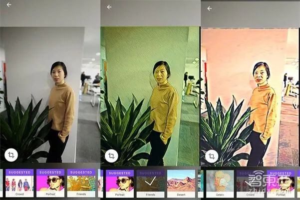 为了体验第三方APP在华为手机AI能力加持下效果如何,我们特意找了一位清新脱俗的妹子作为模特,随意站在办公室一角拍了一张照片,光线、背景、构图什么的都不考虑。然后调用Prisma图片处理功能,选择了图中的两种渲染效果,经过大概近3秒的处理,就自动生成了图中后面两张渲染照片,是不是随手拍的照片瞬间就有了艺术风格。