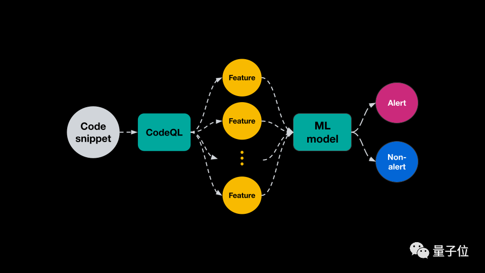 GitHub不是将每个代码片段简单地视为一串单词或字符,直接应用标准NLP技术对这些字符串进行分类,而是利用CodeQL访问有关底层源代码的大量信息,为每个代码片段生成一组丰富的feature,然后像NLP那样对它们进行标记和子标记。