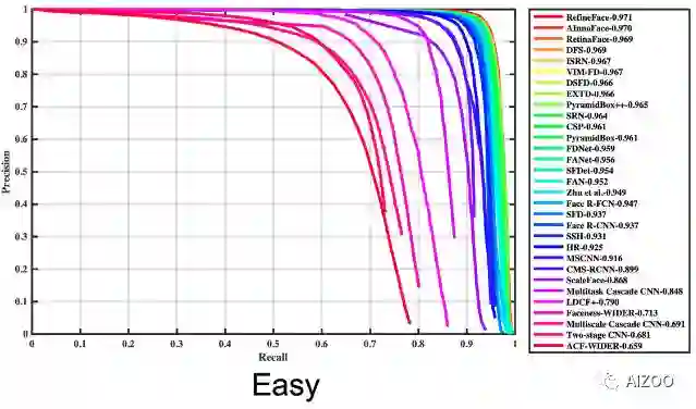 下图是众多基于深度学习的人脸检测算法的性能评估PR曲线。可以看到基于深度学习的人脸检测算法的性能,大幅超过了VJ算法(曲线越靠右越好)。近两年来,人脸检测算法在WIDER Face的简单测试集(easy 部分)上可以达到95%召回率下,准确率也高达90%,作为对比,VJ算法在40%召回率下,准确率只有75%左右。
