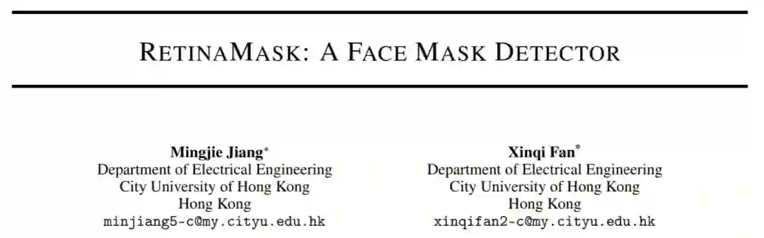 为了促进人类的公共医疗保健,我们提出RetinaMask,这是一种高精度,高效的口罩检测器。提出的RetinaMask是一种单阶段检测器,由一个将高级语义信息与多个特征图融合的特征金字塔网络和一个专注于检测面罩的新型上下文关注模块组成。