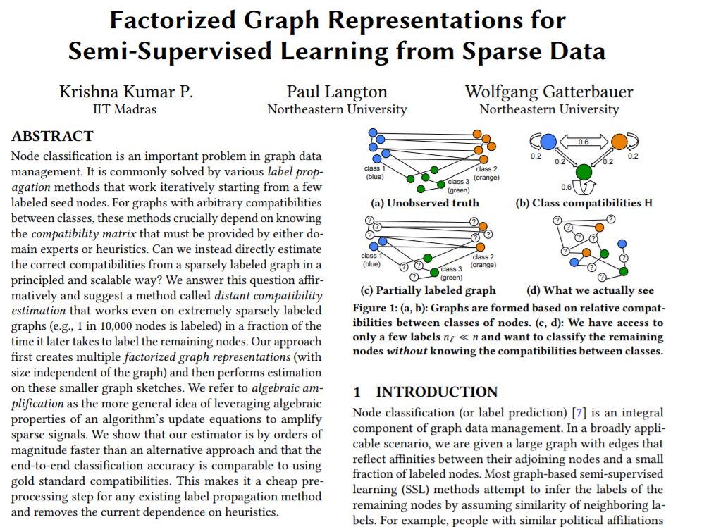 节点分类是图数据管理中的一个重要问题。它通常由不同的标签传播方法来解决,这些方法从几个有标签的种子节点开始迭代地工作。对于具有类之间任意兼容性的图,这些方法主要依赖于了解必须由领域专家或启发式提供的兼容性矩阵。我们能否以一种有原则和可伸缩的方式,从一个稀疏标记的图中直接估计正确的兼容性?我们肯定地回答了这个问题,并提出了一种称为远程兼容性评估的方法,这种方法甚至可以在标记极为稀疏的图(例如,标记了10,000个节点中的1个)上工作,而这只是标记其余节点所需时间的一小部分。我们的方法首先创建多个因式图表示(大小与图无关),然后对这些更小的图草图进行估计。我们将代数放大定义为利用算法更新方程的代数性质来放大稀疏信号的更一般的思想。我们证明了我们的估计器要比其他方法快几个数量级,并且端到端的分类精度与使用真实标准兼容性相当。这使得它对于任何现有的标签传播方法都是一个廉价的预处理步骤,并且消除了当前对启发式的依赖。