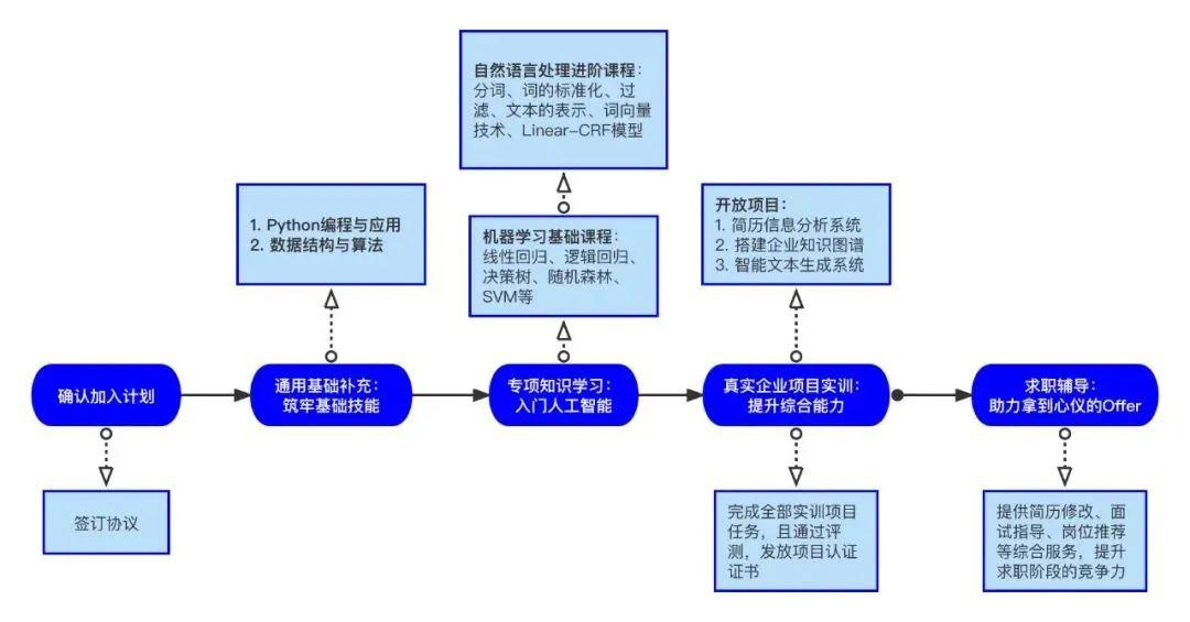 算法工程师上岸计划通过补充通用基础,学习专项知识、参与真实企业项目实训、面试与求职辅导等一体化和个性化服务,帮助学员筑牢基础的知识和技能,并在真实企业项目中实践和提升,最终成功成为一名算法工程师,由此开启人工智能的职业生涯。本计划共分为3个阶段。