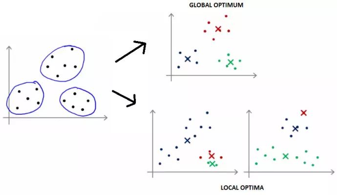 幸运的是,解决方案相当简单——只要用k-means算法多运行几次,然后选择最好的结果就好了。这个解决方案很有帮助,因为在一开始,随机初始化k-means算法,比方说,运行10次,那么会得出局部最优解。当然,这增加了运行时间,因为它运行了很多次,却只需要一个结果。另一方面,完全可以在并行的甚至是不同的集群上运行算法,所以通常可以作为一个工作解决方案。