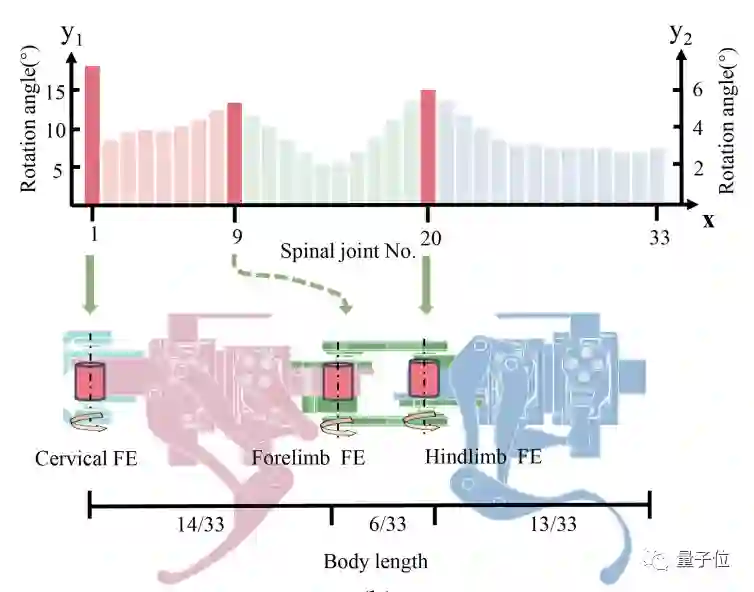 机器小鼠共有33个脊椎关节,研究者将后肢屈伸的关节设置于第22个关节处,这与老鼠的对应的关节位置相似。