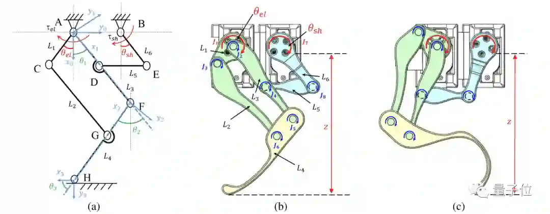 图a、b分别为左前肢的机构运动简图和骨架模型结构;c为左后肢的骨架模型侧视图。