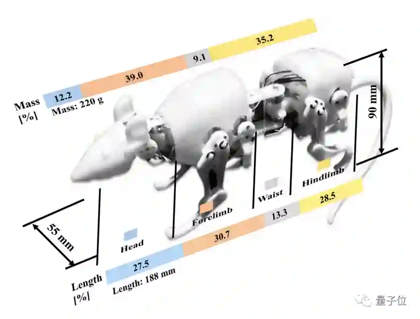 于是,研究人员为机器老鼠配置了12个活动自由度(四肢各有2个自由度,腰部2个屈伸自由度,颈部2个自由度),以及4个被动自由度,以模仿关节的屈伸和转动。