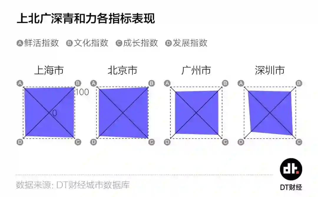 除了青和力得分高低,城市在各项指标上的得分偏向,可能是更加具体有效的参考。
