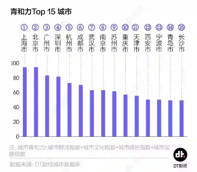 综合考虑了城市规模、区域影响力、经济活跃度等因素后,DT君将35个城市纳入本次测评,最终,青和力排名前15位的城市依次如下:上海、北京、广州、深圳、杭州、成都、武汉、南京、苏州、重庆、天津、西安、宁波、青岛、长沙。