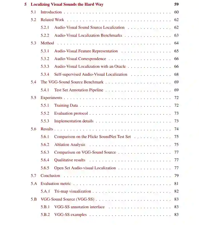 首先,我们自动管理一个大型音频数据集VGG-Sound,使用视觉引导收集了超过200k的视频,并在此基础上进行训练,生成最先进的音频识别模型。其次,我们提出了一种改进和扩展最近声源定位技术的方法,通过引入一种机制来挖掘硬样本并自动将其添加到对比学习公式中。最后,与在一个特定领域执行的现有视听同步任务不同,我们建议通过探索使用几种基于transformer的体系结构来解决开放世界设置中的同步问题。通过这些模型,我们在具有挑战性的语音数据集中获得了最先进的结果,并在一般声音数据集中显示了出色的泛化效果。