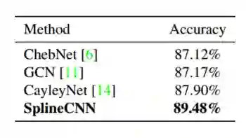 表二 不同学习方法(ChebNet,GCN,CayleyNet和SplineCNN)的Cora数据集上的图形节点分类。 显示精度是100次实验的平均精确度,其中对于每个实验,网络被训练200个epoch。