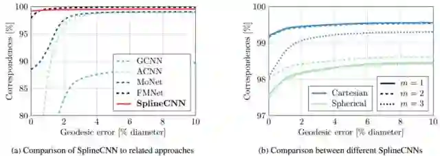 表三 (a)SplineCNN及相关方法和(b)不同SplineCNN实验的形状对应实验的测地误差图。 x轴以直径的百分比显示测地距离,y轴显示位于正确节点周围给定测地半径内的对应关系的百分比。 我们的SplineCNN实现了低测地误差的最高精度,并且明显优于MoNet,GCNN和ACNN等其他常规方法。