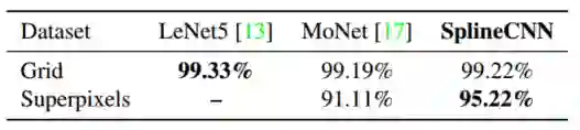 表一 经典CNN(LeNet5),MoNet和SplineCNN方法测试MNIST数据集(网格和超像素)的分类精确度