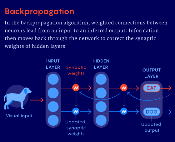 然而,人类和机器实现信用分配问题的过程并不完全相同。对于机器来说,当训练一个识别图像的深度神经网络时,它会分成两个阶段进行:首先是前向传播,然后是反向传播,期间网络会进行「学习」这一过程。在第一阶段,输入层中的神经元编码图像的特征并将其传递,然后隐藏层中的神经元执行计算并将它们的结果传递到输出层,输出层对输出图像进行预测。比如输入一张狗的图像,模型预测出来是一张猫,这时反向传播算法通过调整连接神经元的权重来解决问题,使得模型预测结果是一只狗。