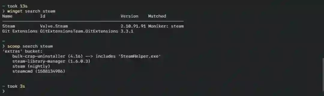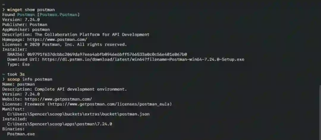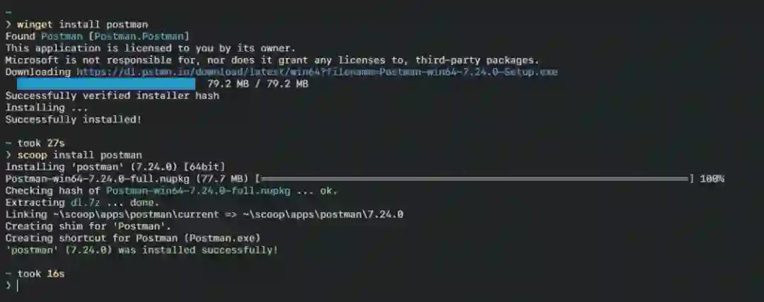 安装软件大家都一样,同样都是 winget install {软件名称} 和 scoop install {软件名称}。比如这里,我分别使用 WinGet 和 Scoop 下载安装 Postman:
