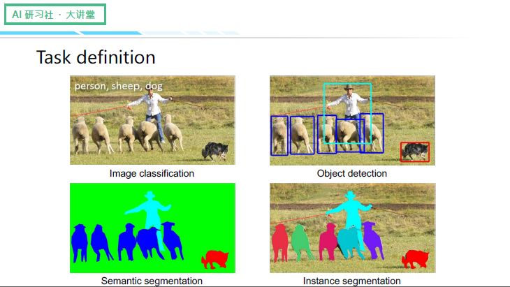 Semantic segmentation:语义分割,这个任务是指对图片中的每个 pixel 打上标签,比如这里要给它们打上 person、sheep、dog 的标签,需要进行非常精细的分类。