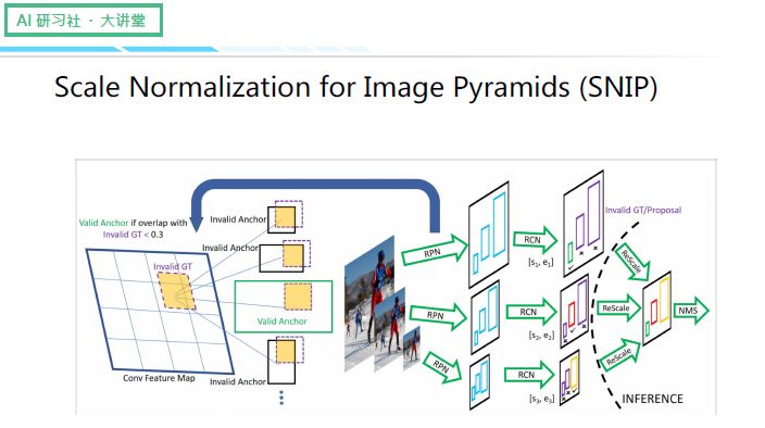SNIP(Scale Normalization for Image Pyramids)是我认为另一篇比较有启发性的工作。它提出的问题是:在 train 分类器的时候,究竟是要 scale specific 还是 scale invariant。传统的 detector 通常会选择 scale invariant,但 SNIP 研究了一下之前的方法后,发现之前的训练方式得到的 feature 对 scale 并没不是很 robust,因而提出要尽量减少 scale 的 variance,让训练时的 scale 尽可能地相似。