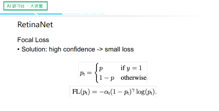 Focal loss 的核心思路是:对于 high confidence 的样本,给一个小的 loss——这是因为正负样本不平衡,或者说是由于 class imbalance 导致了这样的问题:比如说正负样本的比例是 1:1000,虽然负样本的 loss 都很小,但数目非常多,这些负样本的 loss 加起来的话,还是比正样本要多——这样的话,负样本就会主导整个框架。其具体公式表示如下图所示: