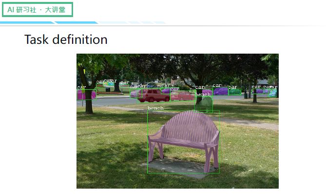 Instance segmentation:实例分割,可以理解为进行物体检测后,对每个矩形框中的物体进行语义分割,该任务除了需要找到物体的类别和位置之外,还需要分辨出不同物体的 pixel。