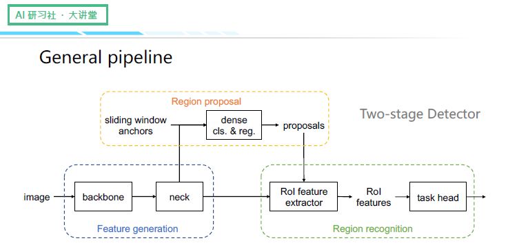 在此之前,先讲一下物体检测一般的 pipeline。下图是一个 Two-stage Detector,它的 pipeline 首先有一张图片,之后的步骤共分为三个部分: