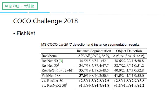 FishNet 这个工作的论文被 NIPS 2018 收录了。它的想法是:对于图像分类来说,需要的是深层的、低分辨率的特征,而不考虑空间上的信息;但是对于 segmentation 和 detection 来说,需要空间上的信息,因此需要的是深层的和高分辨率的特征,因此我们就将这两种思路结合起来设计了 FishNet。具体设计大家可以参考论文。
