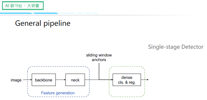 第一部分是 Feature generation:首先图片经过 backbone(分类网络)后,会生成 feature; 之后 feature 或者直接进行 prediction,或者再过一个 neck 进行修改或增强;