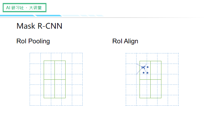 RoIAlign:在 Mask R-CNN 之前,大家用得比较多的是 Rol Pooling,实现过程是:给出一个框,在 feature map 上 pool 出一个固定大小的 feature,比如要 pool 一个 2×2 的 feature,首先把这个框画出 2×2 的格子,每个格子映射到 feature map,看它覆盖了多少个点,之后对这些点做 max pooling,这样就能得出一个 2×2 的 feature。它的劣势是如果框稍微偏一点,得出的 feature 却可能是一样的,存在截断误差。Rol Align 就是为了解决这一问题提出的。Rol Align 并不是直接对框内的点做 max pooling,而是用双线性插值的方式得到 feature。其中还有一步是:在 2×2 的每个框中会选择多个点作为它的代表,这里选择了 4 个点,每个点分别做双线性插值,之后再让这 4 个点做 max/average pooling。