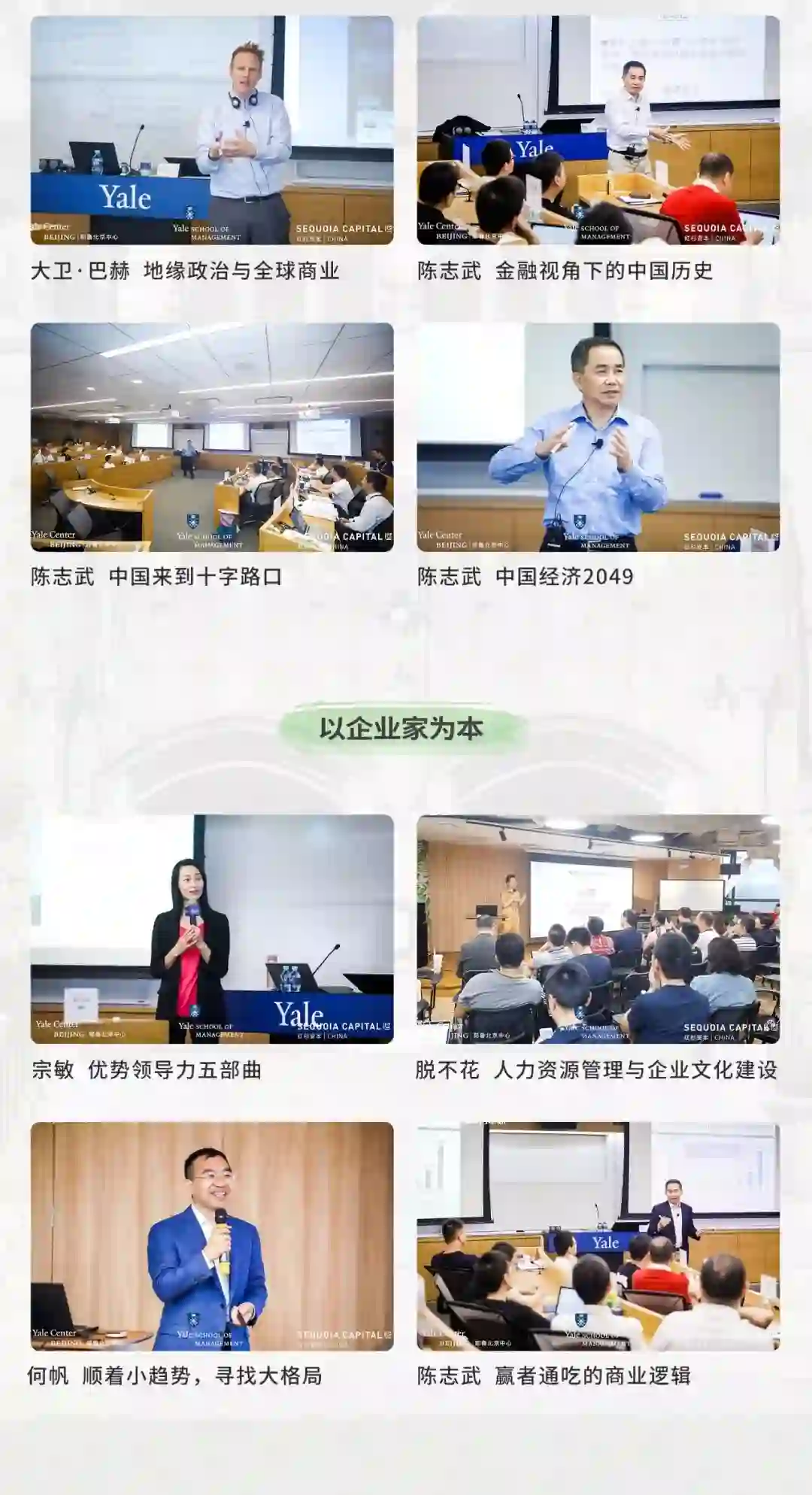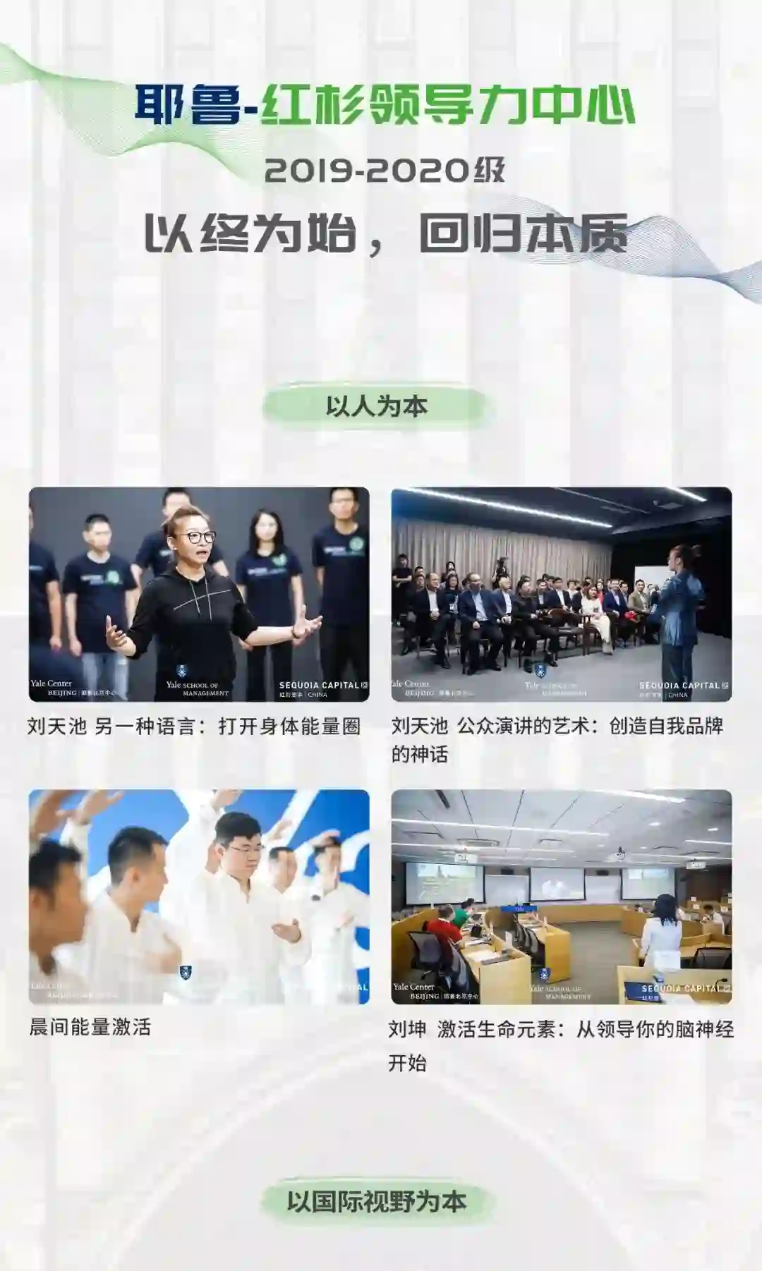 该课程为国内首个由VC/PE基金与常春藤名校联合创办的领导力发展模块,由红杉资本中国基金与耶鲁大学管理学院、耶鲁北京中心联合创办,旨在培养、提升创业者的领导力,打造新型创业者讲堂。
