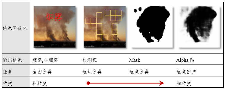 从粒度来说,烟雾分割可分为烟雾区域粗分割和逐像素精细分割。前者常退化为烟雾检测,后者常采用深度学习方法实现。