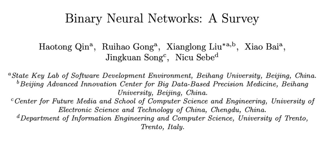 本文介绍了来自北京航空航天大学刘祥龙副教授研究团队的最新综述文章 Binary Neural Networks: A Survey,合作者包括中国电子科技大学的宋井宽教授和意大利特伦托大学计算机系主任 Nicu Sebe 教授。