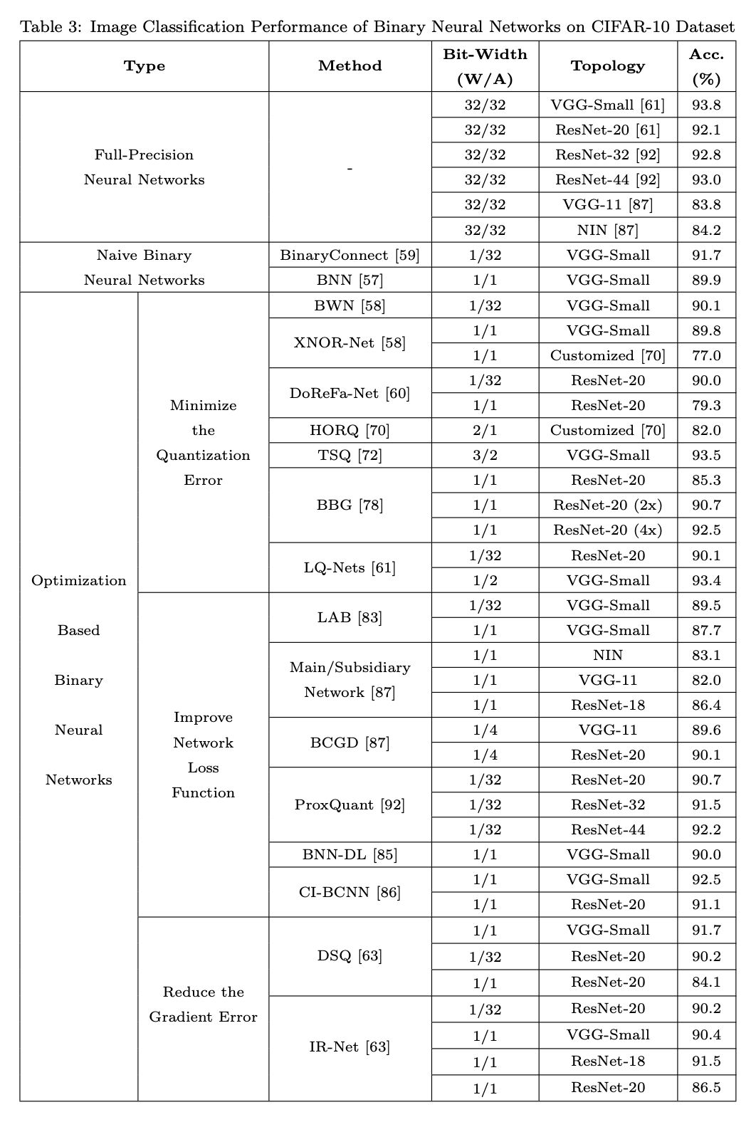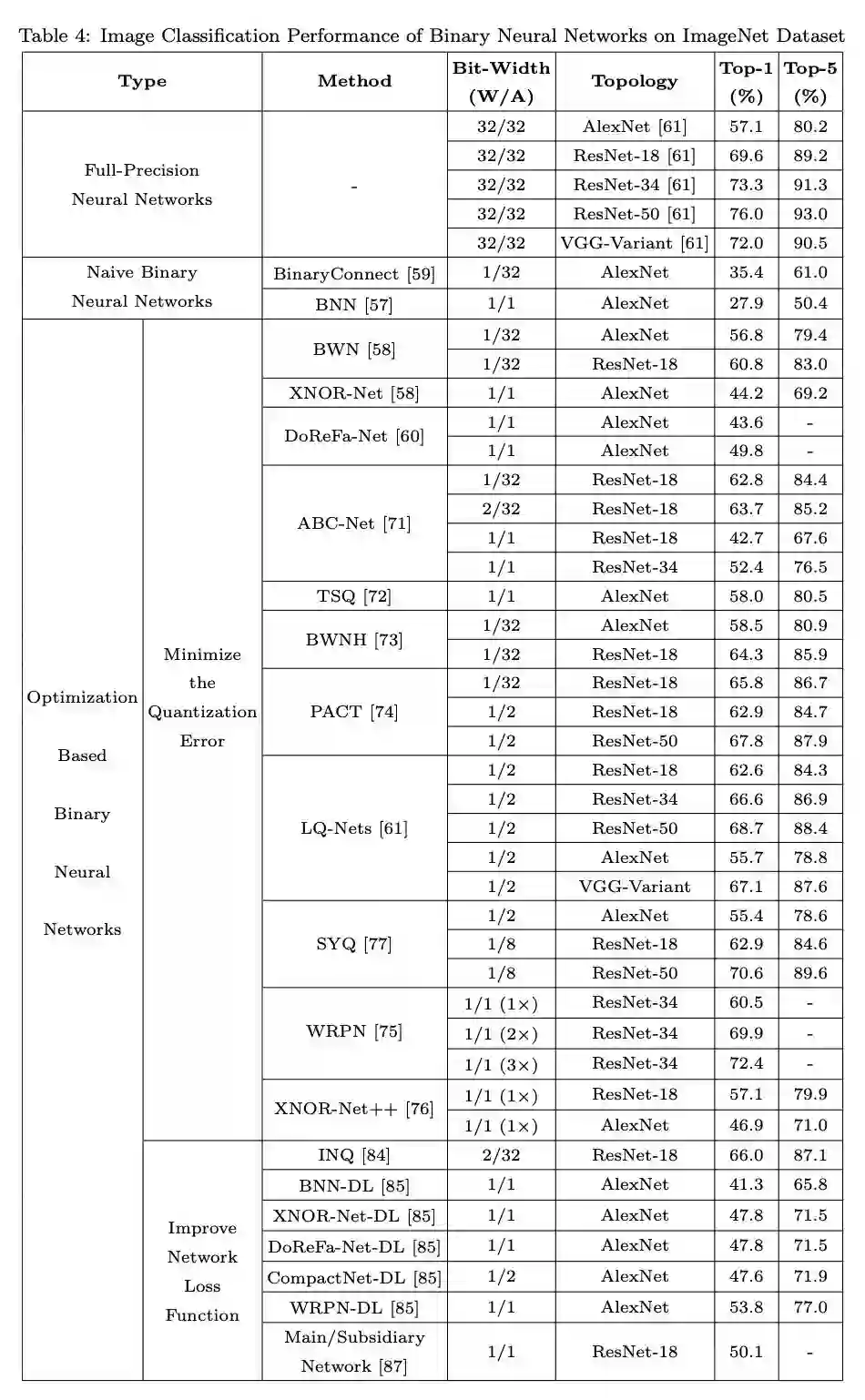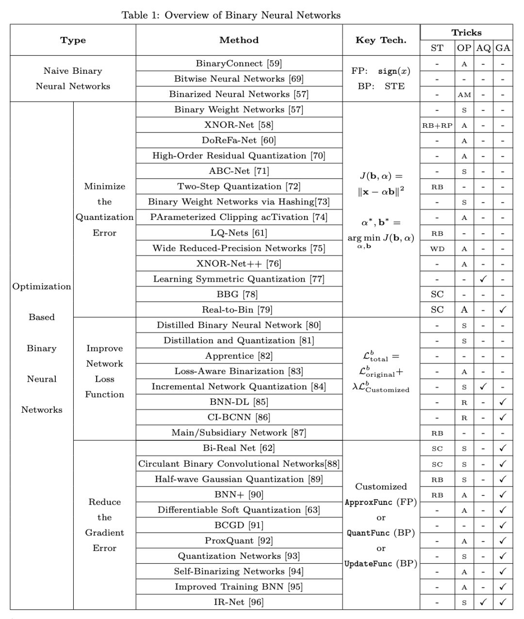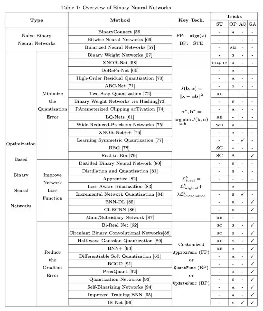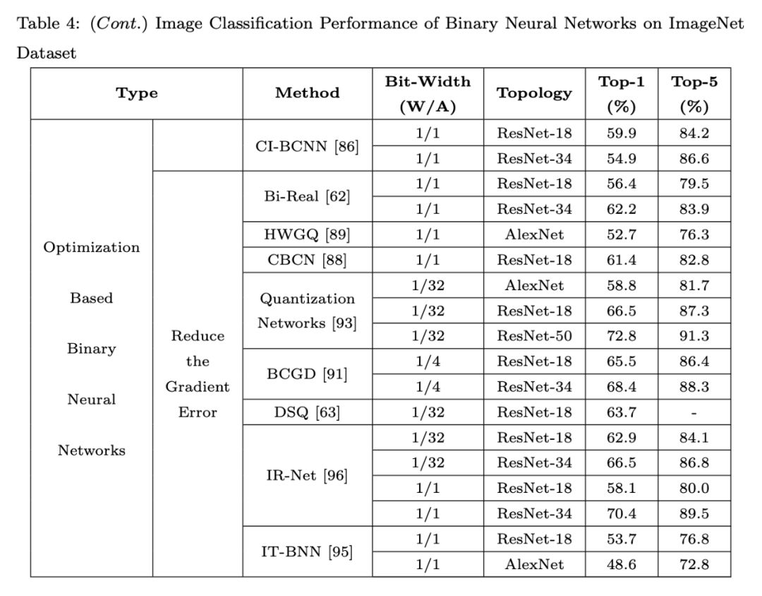 基于优化的不同方法代表对 BNN 的不同理解。在旨在最小化量化误差的论文中,提出了许多直接降低量化误差的方法,以使二元神经网络近似于高精度神经网络。这些论文认为二进制参数越接近全精度参数,BNN 的性能越好。另一个想法是改善损失函数。这种类型的方法通过修改损失函数,使 BNN 中的参数分布对二值化操作友好。
