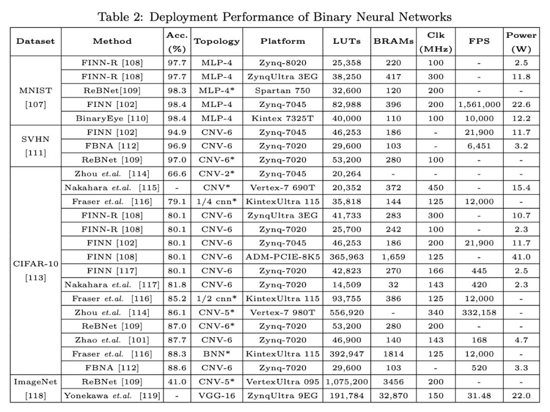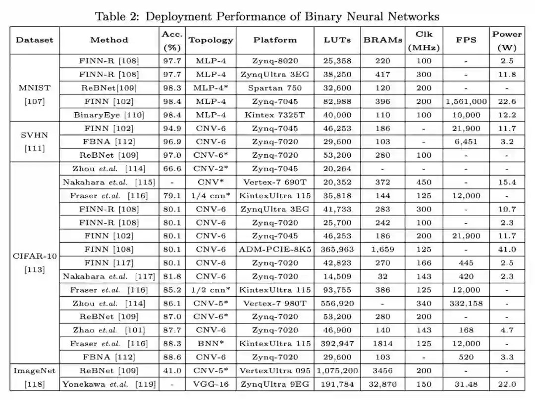 我们在表 2 中的不同 FPGA 平台上列出了不同的二值神经网络实现的比较。可以看出,一些提出的方法虽然效率不高,可以达到与全精度模型相当的精度。我们必须指出,尽管在开发硬件友好算法方面取得了进步,但到目前为止,在速度和准确性方面,只有很少的二值模型能够在如 ImageNet 之类的大型数据集上良好地运行。