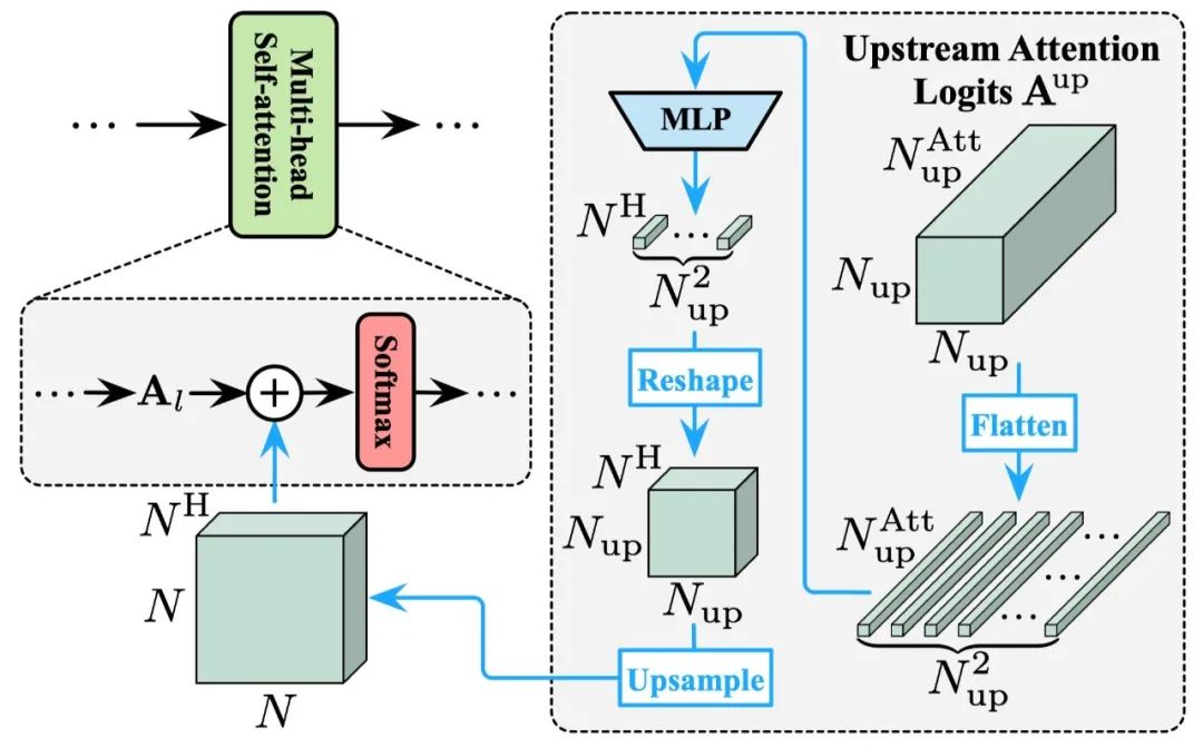 将上游模型的全部注意力图以 logits 的形式进行整合,经 MLP 变换和上采样后,加入到下层每个注意力图的 logits 中。这样,下游模型每一层的 attention 模块都可灵活复用上游模型不同深度的全部 attention 信息,且这一复用信息的“强度”可以通过改变 MLP 的参数自动地调整。