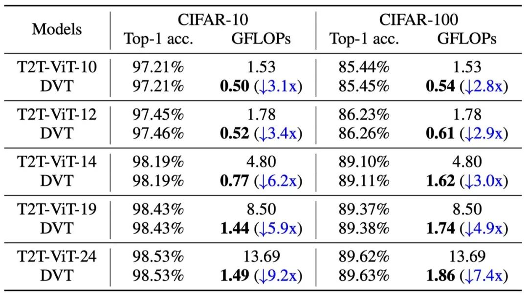 DVT(T2T-ViT-12/14)在 CIFAR 图像识别任务上的计算效率如下。