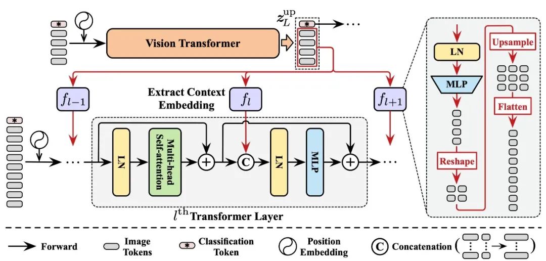 显然,DVT 框架中所有的 Transformer 都具有相同的训练目标。因此当一个处于下游位置的 Transformer 被激活时,一个显然更为高效的做法是,应当训练其在先前 Transformer 已提取的特征的基础上进行进一步提升,而非完全从 0 开始重新提取特征。出于这一点考虑,论文提出了一个特征复用机制,如下图所示。将上游 Transformer 最后一层输出的特征取出,经 MLP 变换和上采样(Upsample)后,作为上下文嵌入(Context Embedding)以 Concat 的方式整合入下游模型每一层的 MLP 模块中。