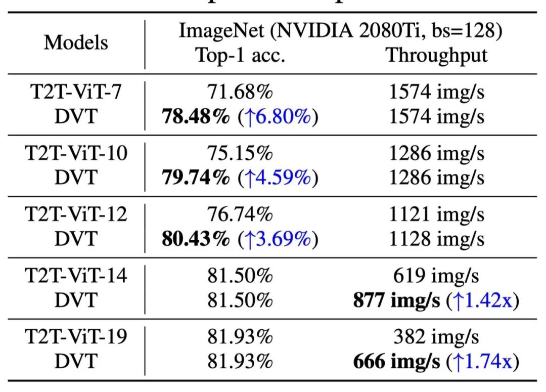 ▲ 表2 DVT (T2T-ViT) 在ImageNet上的实际速度